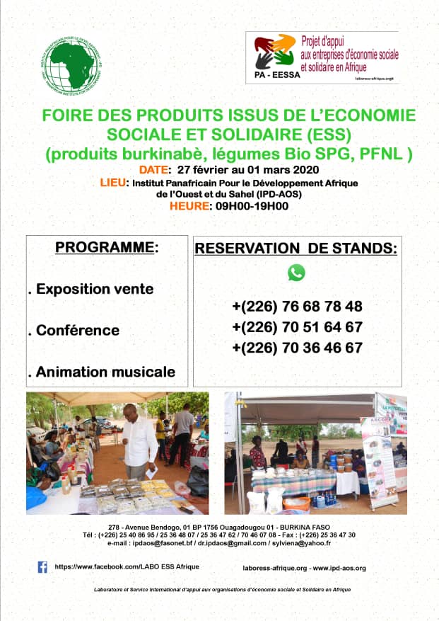 Du 27 février au 1er mars prochain l’Institut Panafricain pour le Développement Afrique de l’Ouest et du Sahel (IPD AOS) à travers le Projet d’Appui aux entreprises d’Economie Sociale et Solidaire en Afrique (PAEESSA) ouvre ses portes au public pour la 2ème édition de la foire des produits issus de l’économie sociale et solidaire.