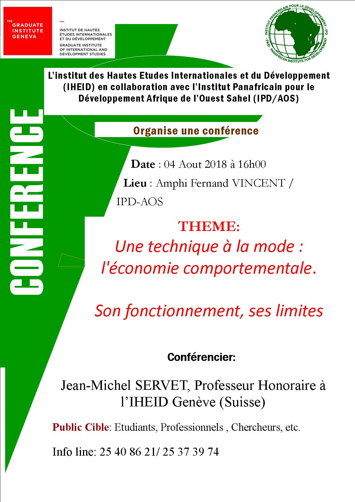 L’Institut des Hautes Etudes Internationales et du Développement (IHEID) en collaboration avec l’Institut Panafricain pour le Développement Afrique de l’Ouest Sahel (IPD/AOS) organise une conférence sur le thème : "Une technique à la mode : l’économie comportementale. Son fonctionnement, ses limites" ;le samedi 04 /08 /2018 à 16h00 dans la (…)